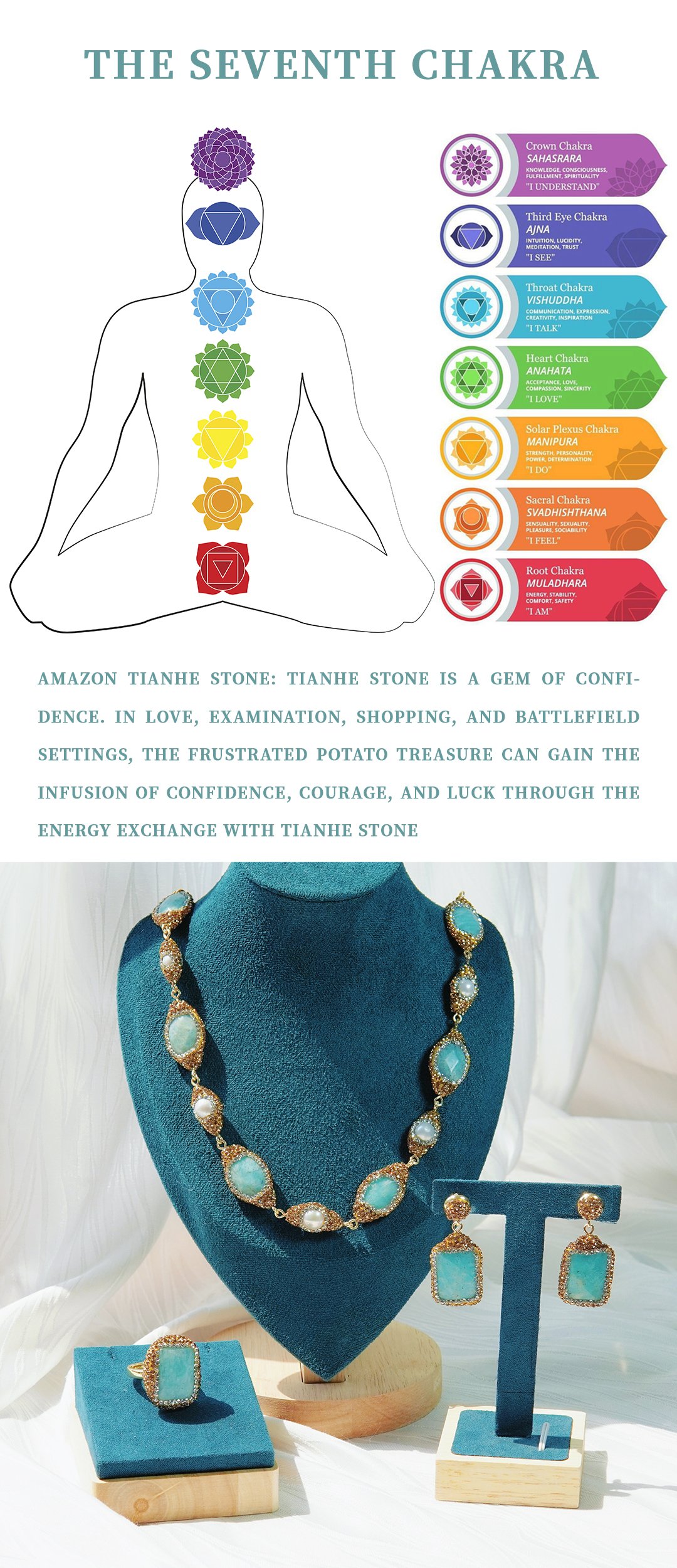 Main Stone: Hand-selected natural Amazonite, prized for its pure teal hues and exceptional clarity. Each stone is precision-cut and polished to enhance both its energetic vibration and visual allure.